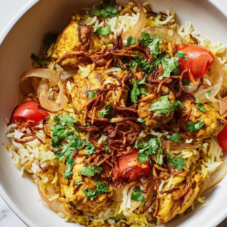 Most biryani loses its charm in the last minute—people forget to garnish or hurry the plating. Those fresh herbs and crispy fried onions aren't decoration; they're textural contrast and brightness that lift the whole dish. A squeeze of lemon right before eating cuts through the richness and makes every spoonful feel fresher.