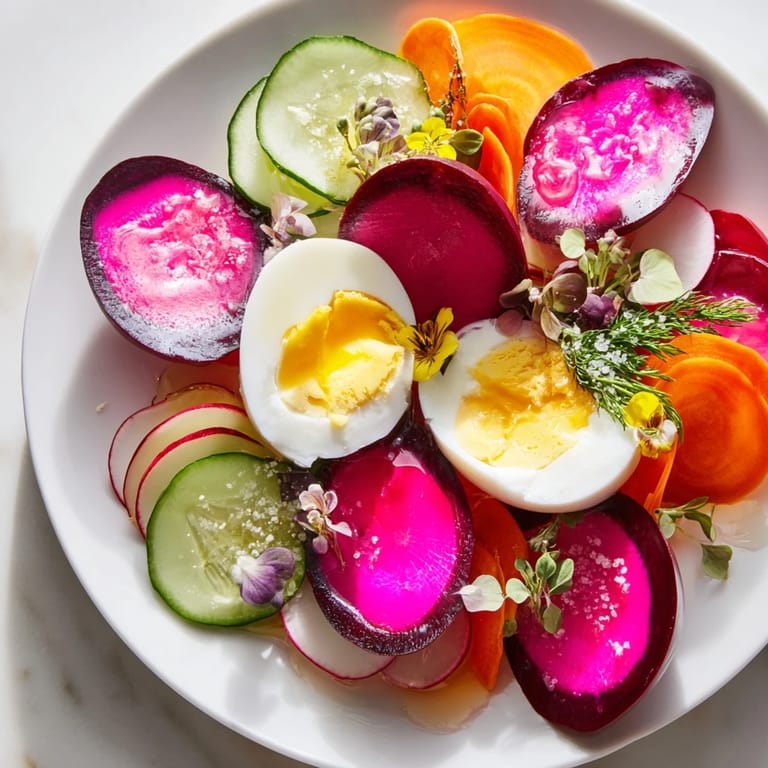 Save I stumbled onto this platter by accident on a summer evening when my fridge held nothing but brilliant vegetables and I'd promised friends a show-stopping appetizer. The challenge of making something dramatic from pickles and eggs became unexpectedly fun, and watching those eggs blush deep magenta in their beet bath felt like tiny edible art projects. When everyone arrived and gasped at the black board crowned with neon colors, I realized sometimes the best dishes come from constraints, not recipes.
